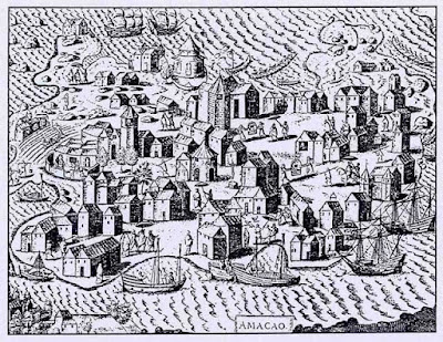 Desta maneira fiz paz; e os negocios na China com que todos fizeram suas fazendas, e proueitos seguramente foram muytos purtuguezes á Cidadde de Camta e outros lugares por onde andaram folgando algūs dias, e negociando suas fazendas á sua von-tade sem receberem agravo, nem pagarem mais Direitos dos que atras digo que muytos pelo que esquonderam nã fiquaram pagando mais Direitos que da terça parte das fazen-das. Cantaõ está trinta legoas por hum Rio dentro do Porto de Sã Choam que he amtre huas ylhas aonde estava com os Navios, porque me nã quis meter em lumpaquã que he na boqua do Ryo, aonde me mandavã hyr por me nã fiar tanto delles, nem numa Cidade que chamão Quoay, que era dahy cinquo ou seis legoas; estas duas Cidades são bem amuradas, e fortes, e asy dizem, que o são as mais, e a de Cantaõ dizem, que he muyto grande em camtidade, e de gramde negocio.